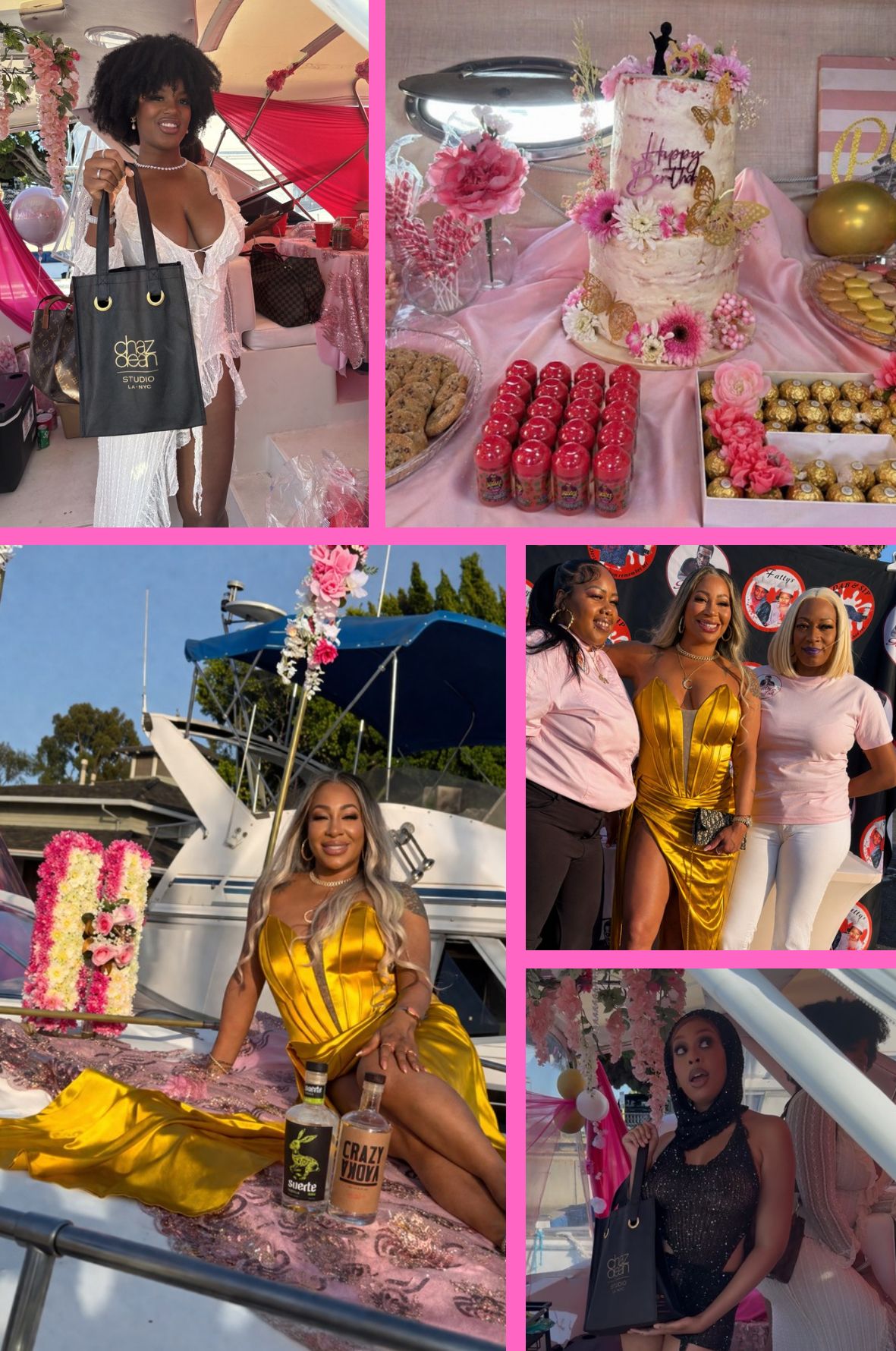 Set against the water with a beautiful coastal view, the yacht offered a relaxed yet elevated setting as guests enjoyed a sunset cruise experience. Custom floral arrangements and feminine décor were placed throughout the space, creating a cohesive Goddess aesthetic. The celebration featured a full-service bar powered by Suerte Tequila and Crazy Bevs. Catering by Fatty's Soul Food kept guests full and satisfied throughout the evening, while music by DJ Mike Luie carried the energy. A custom cake by Sugar Rush by Iisha added a centerpiece moment to the experience that caught everyone's attention. The event was supported by a strong lineup of partners, including Hollow Tips as the official gifting sponsor, the pens, pre-rolls, and gummies had many guests saying they were the best products they ever had. Wen by Chaz Dean provided curated gift bags for attendees, the gift bags were categorized by Male or Female options and included shampoos, conditioners, and either cologne or perfume.